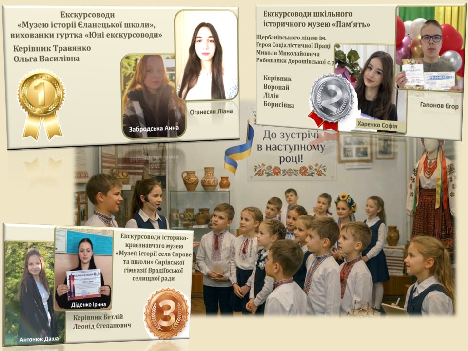 ІІІ місце – Харенко Софія, Гапонов Єгор, екскурсоводи шкільного історичного музею «Пам’ять» Щербанівського ліцею ім. Героя Соціалістичної Праці Миколи Миколайовича Рябошапки Дорошівської сільської ради (керівник Воропай Лілія Борисівна).